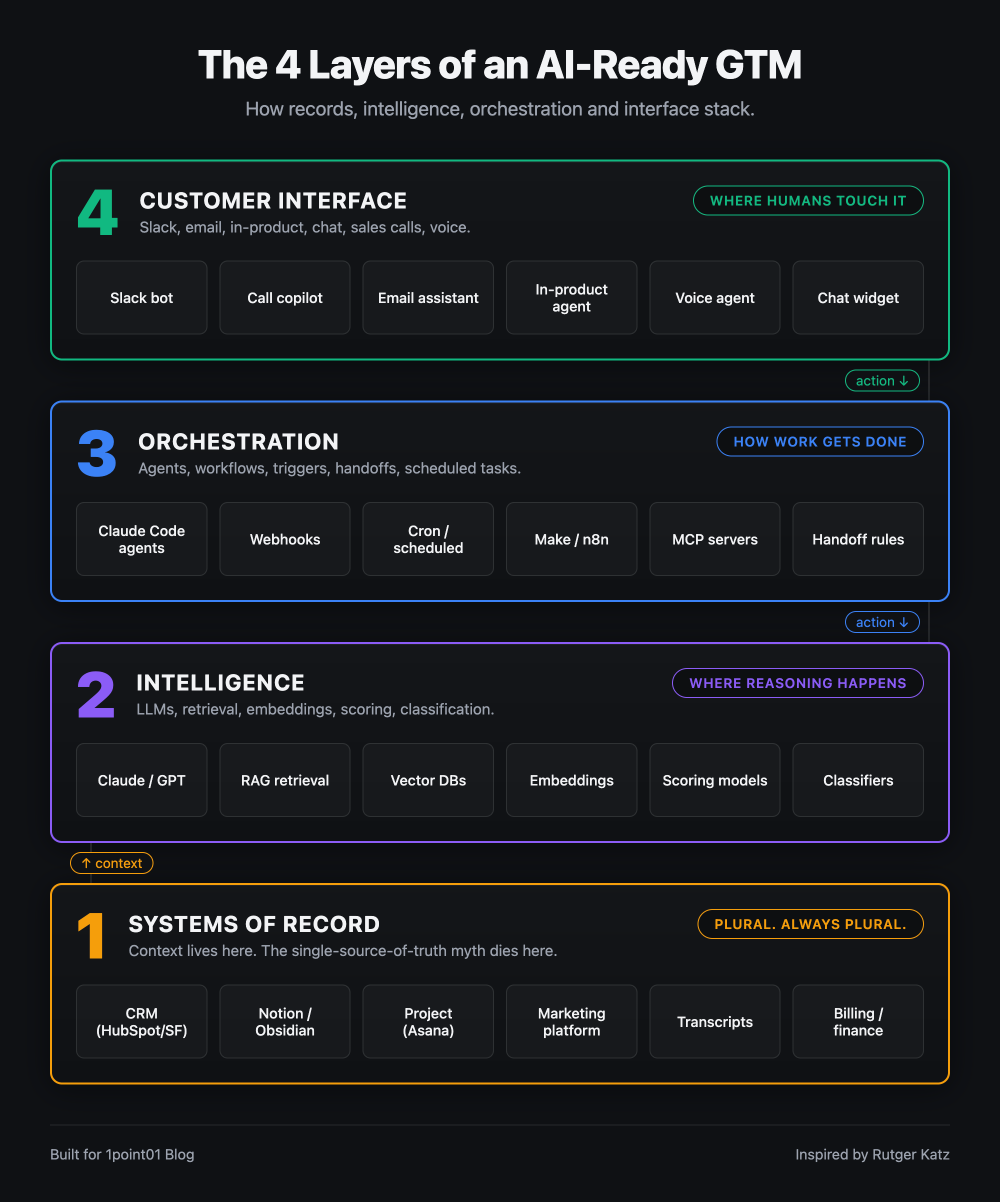 Layer 1: Systems of Record (The Foundation) This is where context lives. For years, the tech industry chased the myth of a "single source of truth." In reality, truth is plural. Your context lives in multiple specialized systems. It lives in your CRM (like HubSpot or Salesforce), your project management tools (like Asana), your marketing platforms, your billing software, and your company wikis (like Notion or Obsidian).